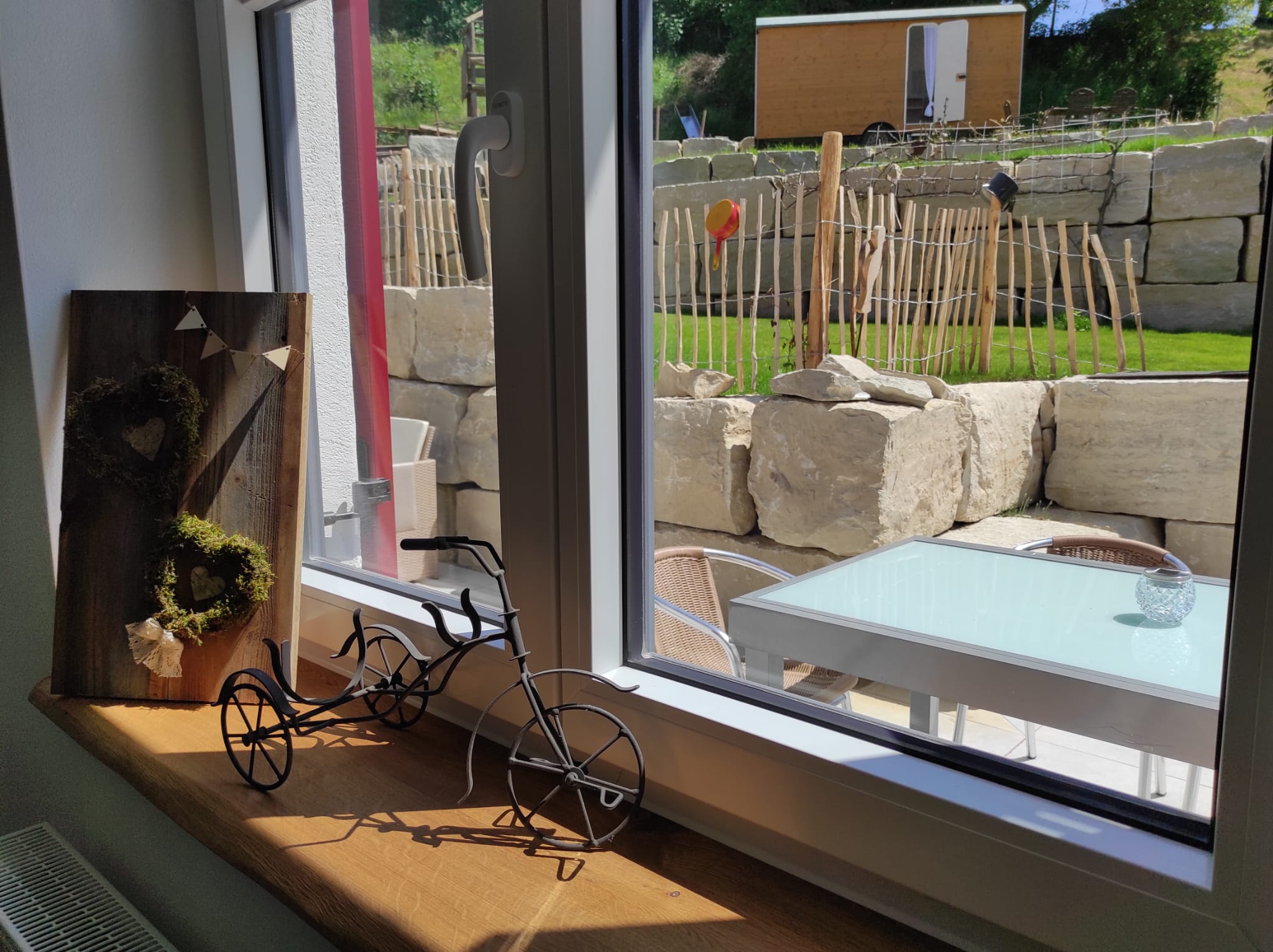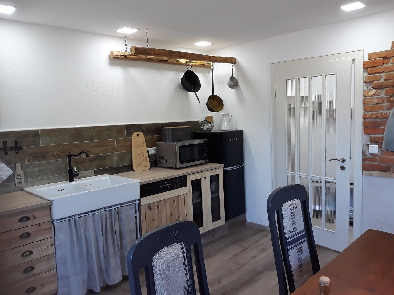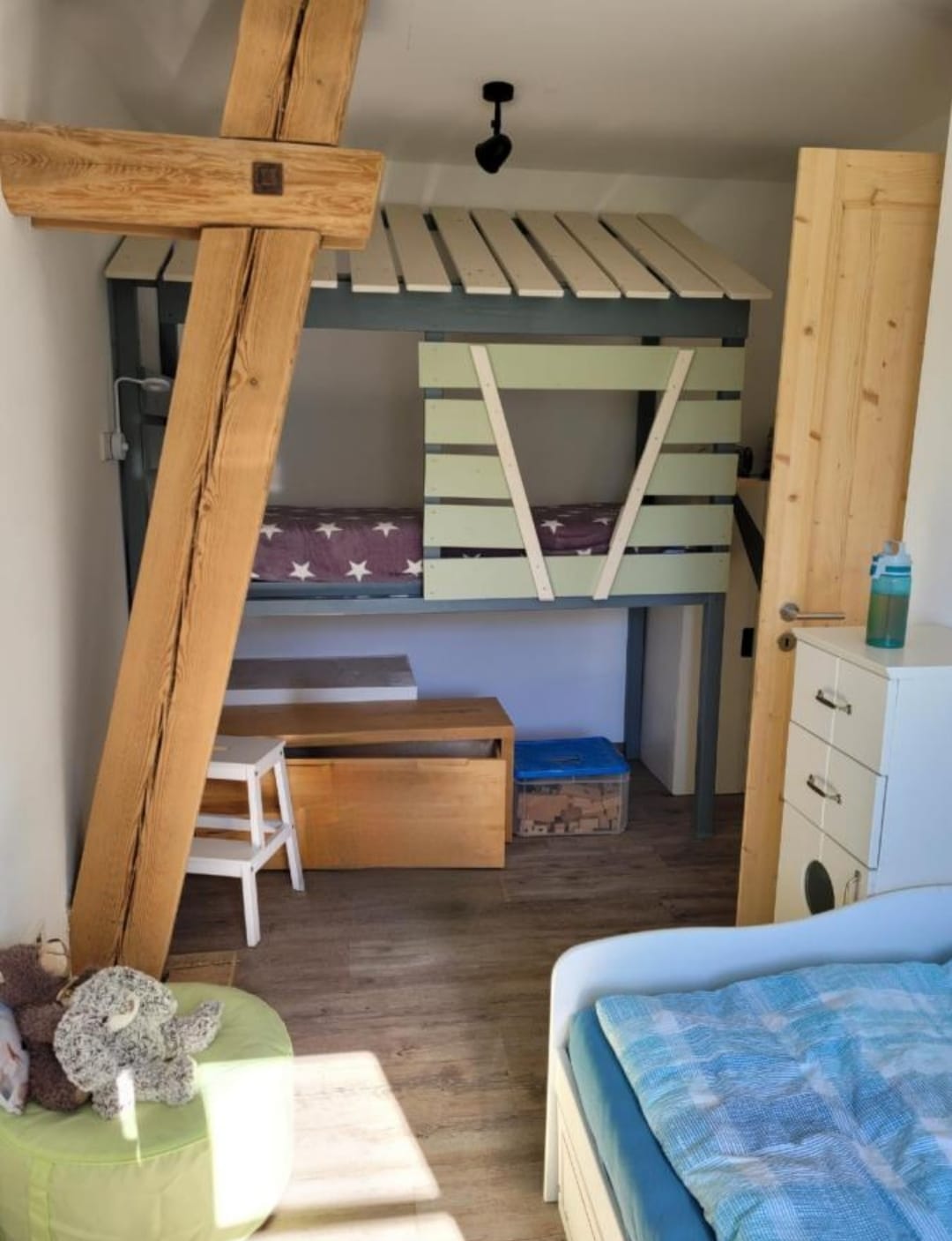 Die ca. 70 qm geräumige Wohnung befindet sich in der restaurierten, ehemaligen Scheune. Sie bietet eine große Wohnküche sowie separate Schlaf- und Kinderzimmer.