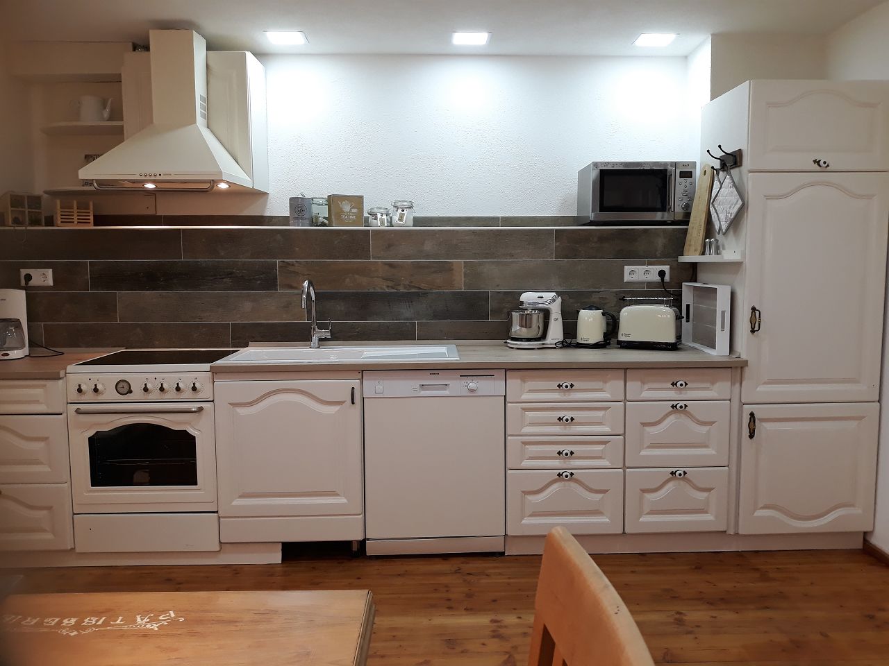 Die vollausgestattete Wohnküche bietet viel Platz zum Kochen und Essen. Das Badezimmer verfügt über eine Dusche.