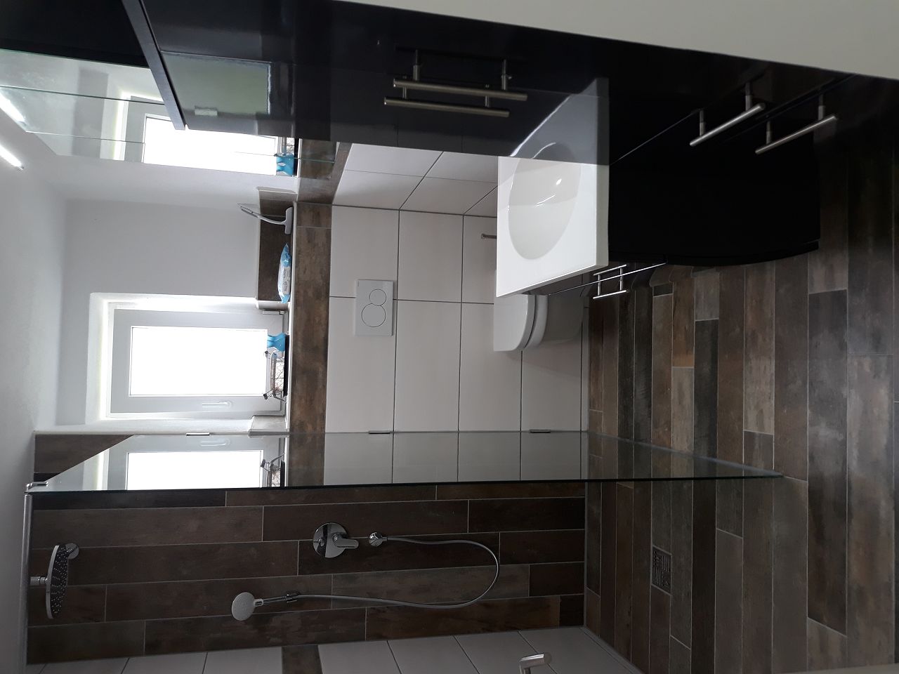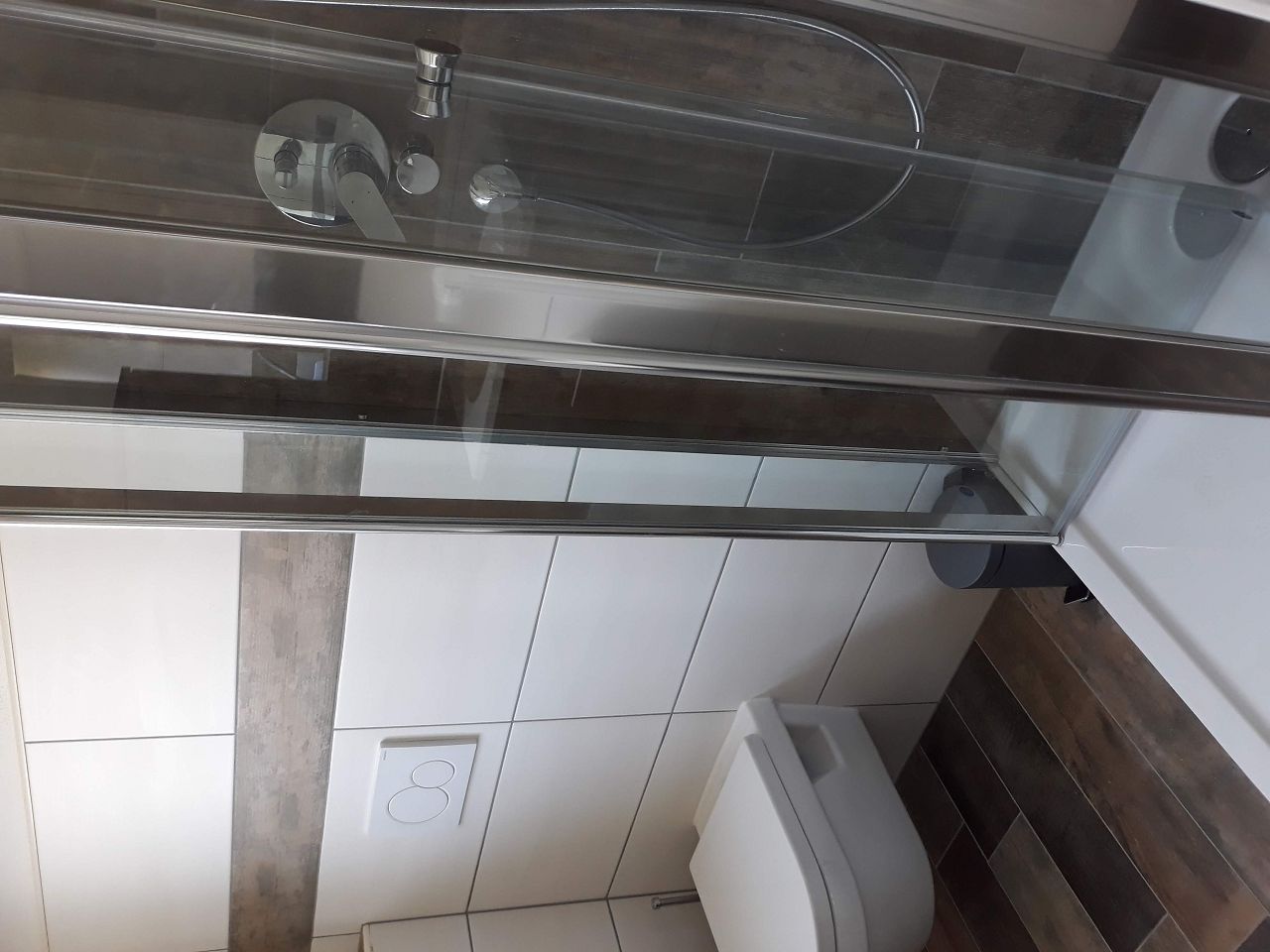 Das moderne Tageslichtbad ist mit Dusche, WC und Waschtisch ausgestattet. Die Küche umfasst Spülmaschine, großen Kühlschrank, Herd und Mikrowelle.