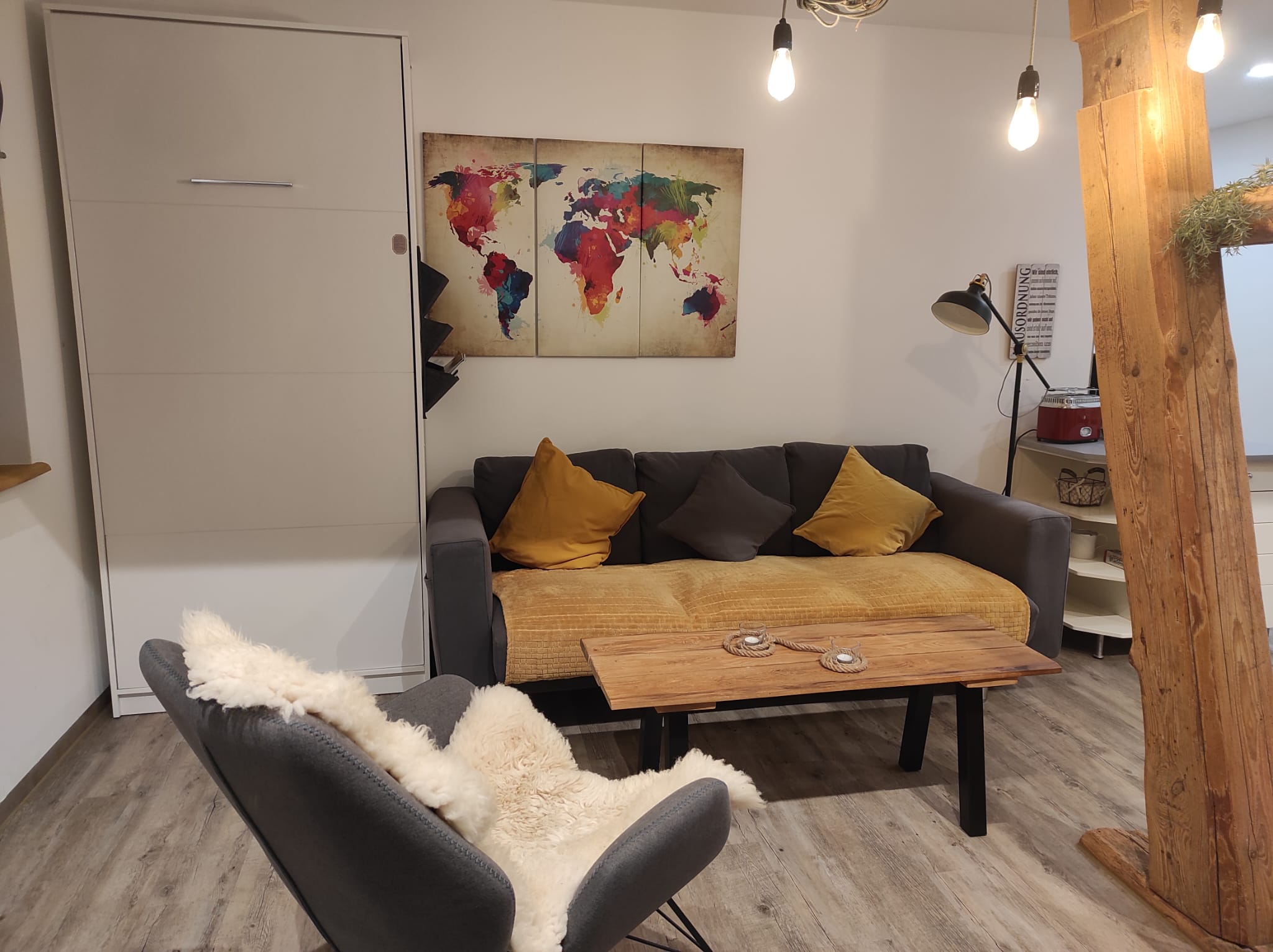 Das ca. 45 qm große Apartment bietet Komfort und Funktionalität. Es hat eine voll ausgestattete Küche, zwei Betten (einzeln oder als Doppelbett stellbar), ein Sofa, Sessel und einen großen Esstisch.