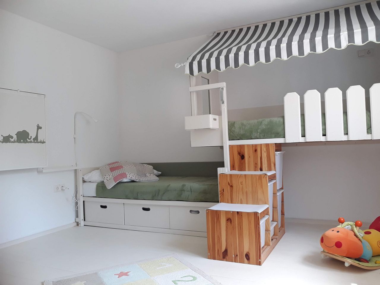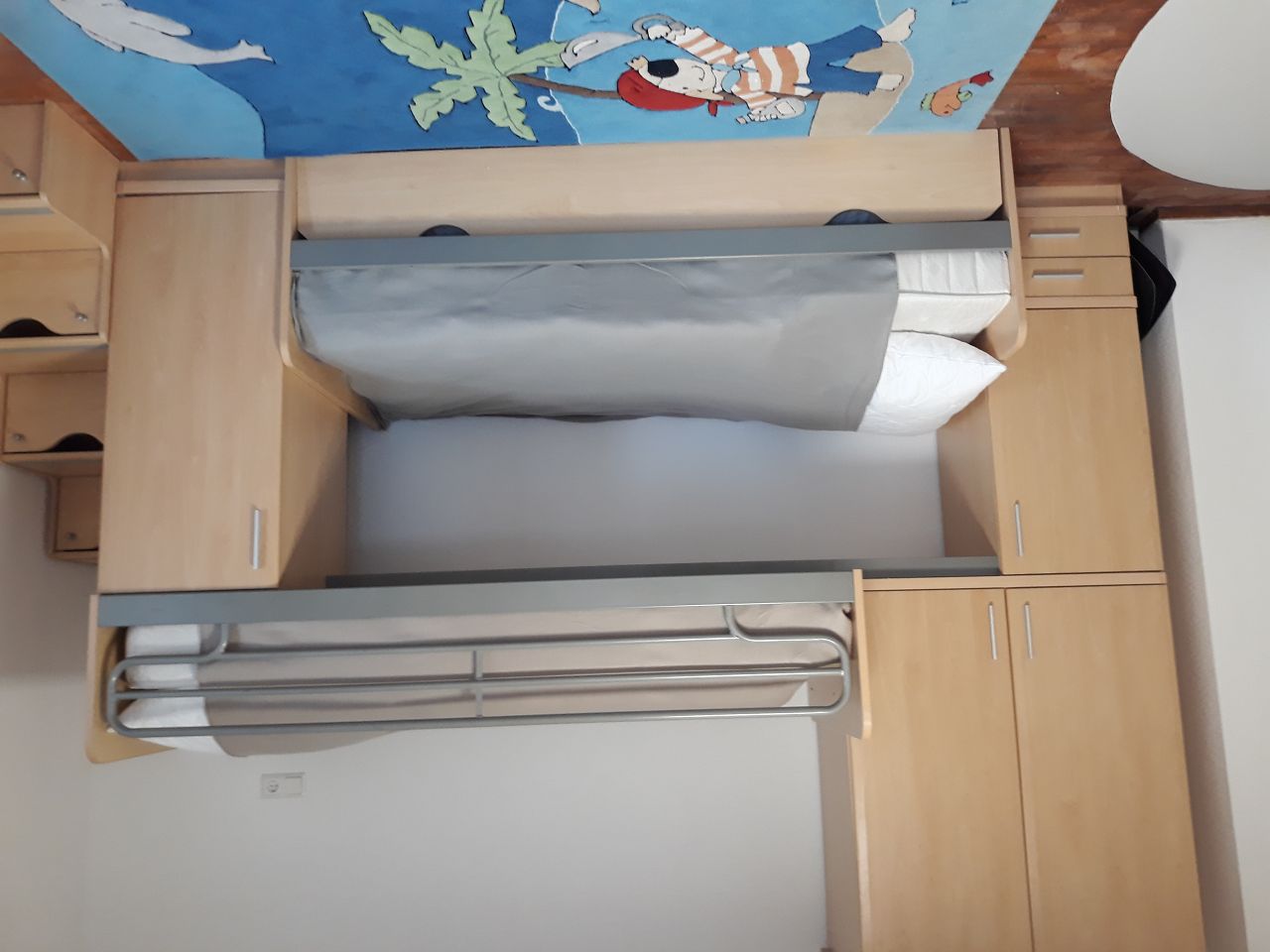 Im Schlafzimmer finden Sie ein gemütliches Boxspringbett (Doppelbett). Das Kinderzimmer verfügt über ein niedliches Hausbett/Hochbett sowie ein weiteres Einzelbett. Zusätzlich besteht im Wohnbereich die Möglichkeit, das Schrankbett auszuklappen.